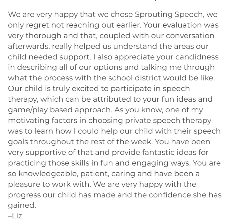 Sprouting Speech of Lake Country provides in-home and in the community services to address apraxia of speech, articulation, Augmentative and Alternative Communication (AAC), expressive language, fluency, phonological processing, receptive language and social communication goals.